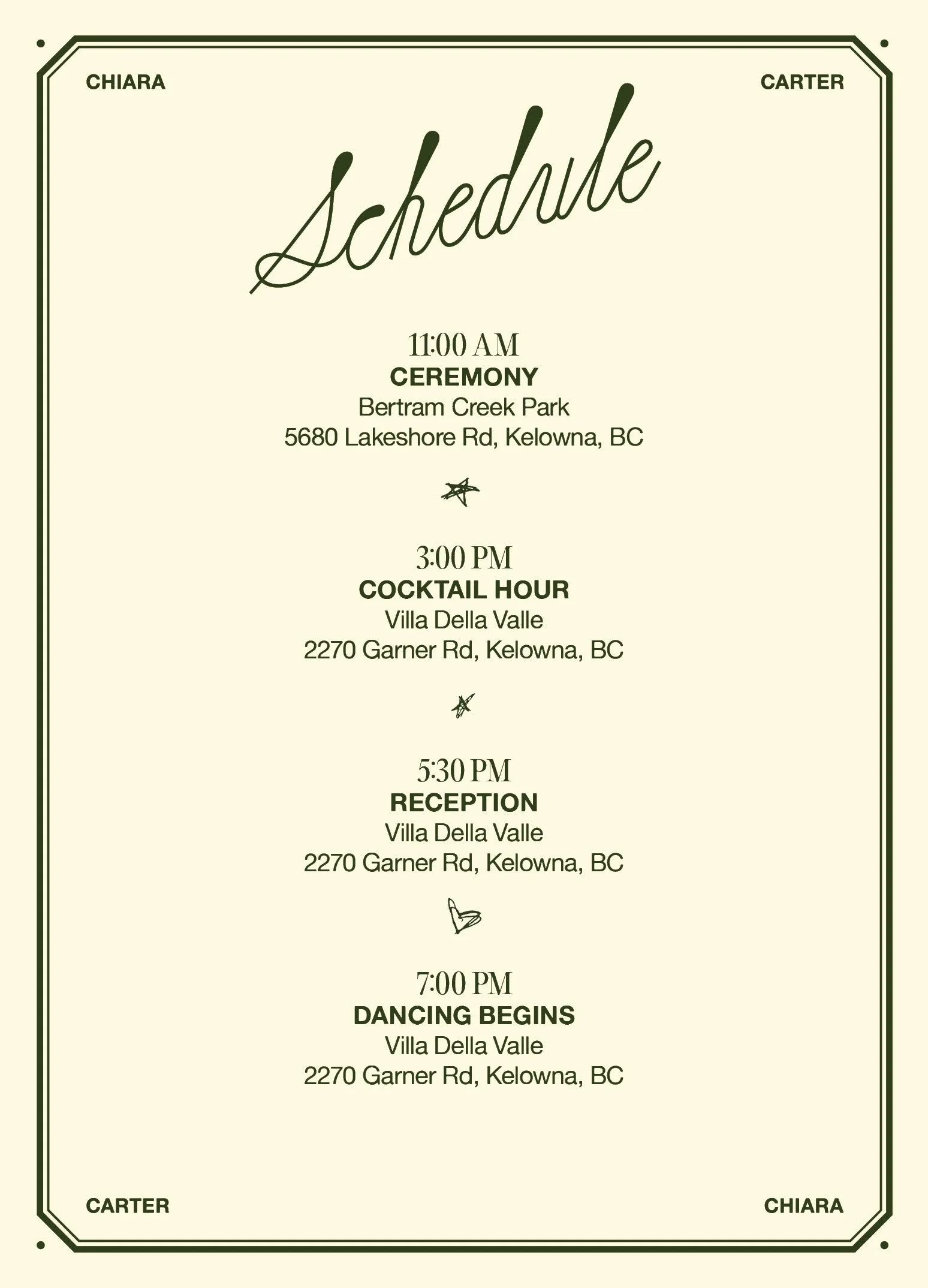 We will send an email to the provided email address a few weeks before the wedding for final details on locations, times, and shuttle information.